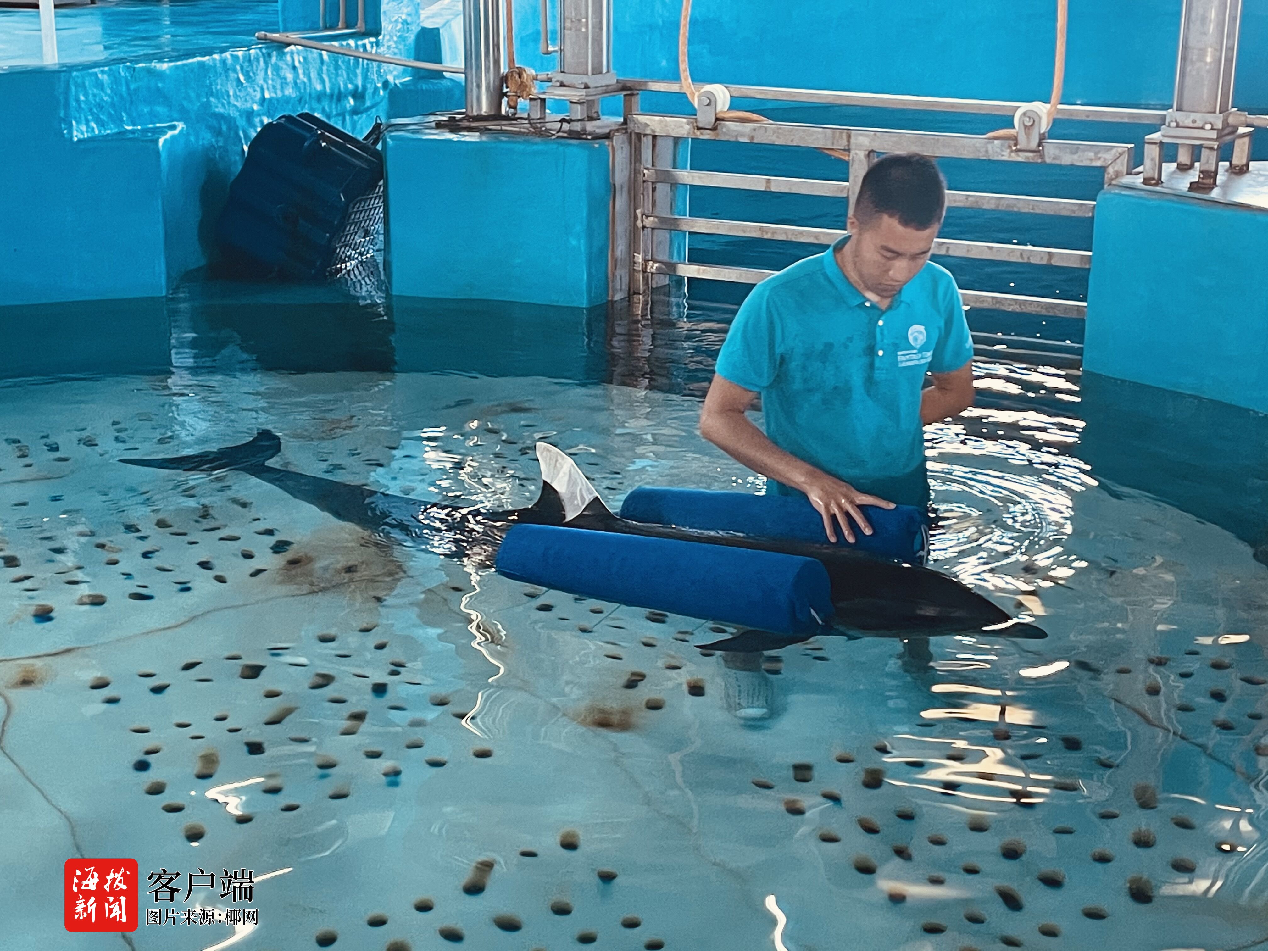 商报全媒体讯(椰网/海拔手机端记者 李莎 摄影报道)6月17日,国际旅游岛商报记者在三亚海昌生物保育中心内看到兽医正在对搁浅海豚进行伴游辅助治疗,目前海豚仍处于方向感不平衡,不能自己完成游行的阶段,但状态平稳。