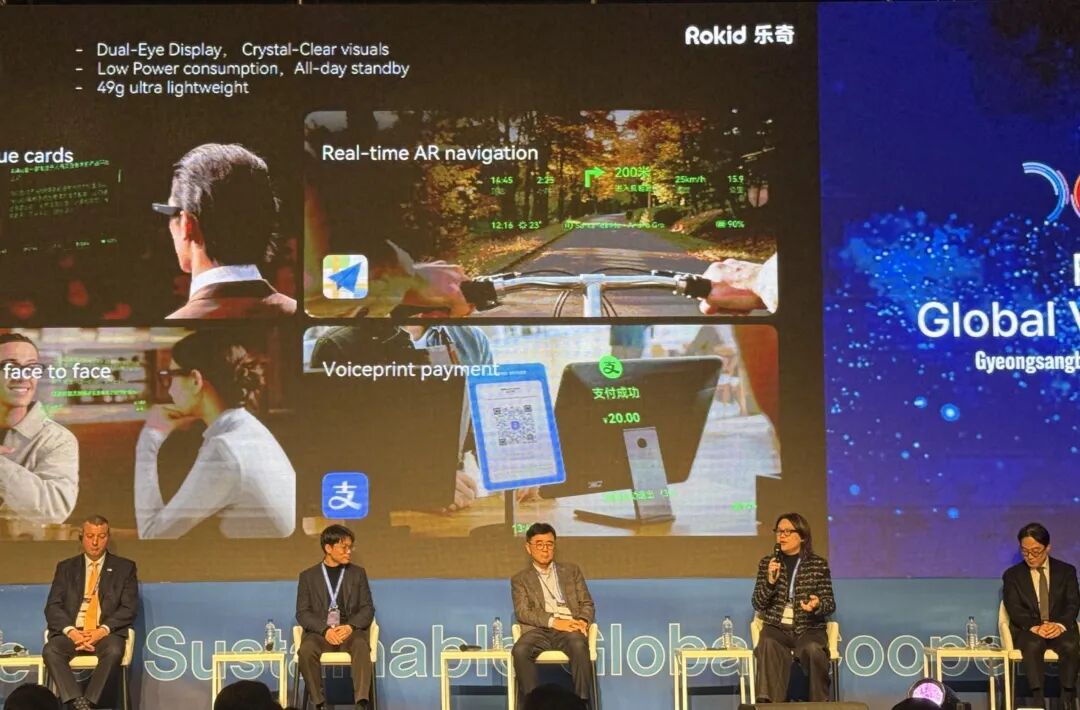 会议期间,举行了以AI、供应链数字贸易、K-文化创意产业、大邱-庆北新机场及投资招商情况说明、加拿大魁北克城市推介等为主题的现场论坛,论坛邀请行业内知名专家、企业家、地区代表共同探讨行业趋势及地方产业基本情况,为与会嘉宾提供前沿信息。Rokid副总裁陈希在分享公司发展概况及展示产品(AR眼镜)期间,赢得了现场嘉宾的广泛关注。